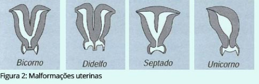 Apresenta prevalência muito variável na literatura médica, mas, enquanto na população geral está em torno de 3-5%, em pacientes com AR são encontradas em 7%-13%, sendo as mais frequentes útero bicorno e septo uterino. Pacientes com essas malformações têm risco aumentado para novo aborto. Uma revisão da literatura mostrou que a incidência de abortos foi de 44% para mulheres com septo uterino e cerca de 36% para útero unicorno, bicorno e didelfo (Figura 2).